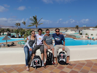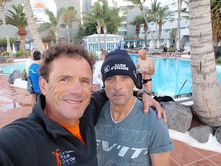 Y luego, una salida en bici , aquí os dejo una foto de Carmelo, Iván , y el que suscribe justo antes de agruparnos con el resto del pelotón. Mucho viento , de ese que no estamos acostumbrados en la Península, pero no viene mal para familiarizarnos con lo que nos espera el sábado.