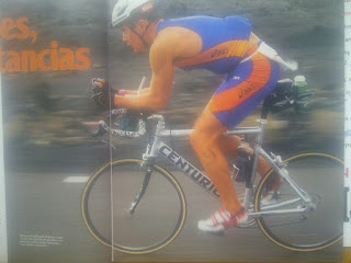 Para los obsesionados con el material, y como homenaje a uno de los más grandes protagonistas del Ironman Lanzarote, os dejo esta instántánea, que pertenece a la mítica Bicisport, en la que podemos ver a Thomas Hellriegel, vencedor en 1995 con el mejor parcial en bici a 37 kms. por hora de media, en las viejas y descarnadas carreteras de la isla, con ruedas de radios y a lomos de una legendaria Centurión de aluminio, bici con la que también triunfara en Hawaii 97.