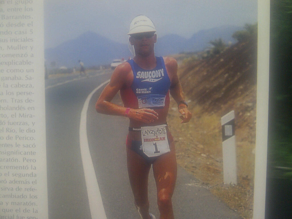 Para los obsesionados con el material, y como homenaje a uno de los más grandes protagonistas del Ironman Lanzarote, os dejo esta instántánea, que pertenece a la mítica Bicisport, en la que podemos ver a Thomas Hellriegel, vencedor en 1995 con el mejor parcial en bici a 37 kms. por hora de media, en las viejas y descarnadas carreteras de la isla, con ruedas de radios y a lomos de una legendaria Centurión de aluminio, bici con la que también triunfara en Hawaii 97.